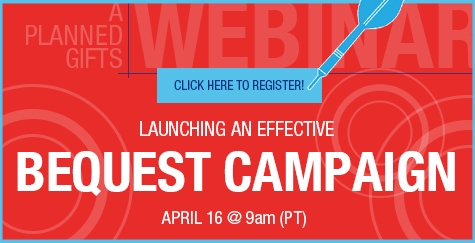 Do you have a strategy for securing bequests to your organization? As the most popular planned gift, bequests can build your organization’s endowment and create a sustainable source of current revenue for the future. Learn how to launch a bequest campaign using your website, print, email, social media and other marketing tools to reach your donors and motivate these transforming gifts. To join us for this free webinar click here to register.